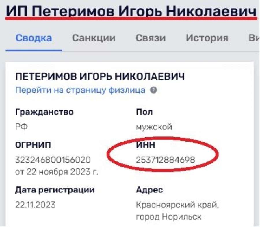 А недавно произошло событие, вообще из ряда вон выходящее. 22 ноября прошлого года Игорь Николаевич Петеримов зарегистрировался в Норильске как индивидуальный предприниматель с основным видом деятельности «Строительство жилых и нежилых зданий». Да, это тот самый Петеримов, с ИНН (индивидуальным номером налогоплательщика, который присваивается человеку один раз в жизни и сохраняется за ним навсегда) 253712884698. При этом он остается начальником муниципального (!) казенного учреждения «Норильскавтодор».