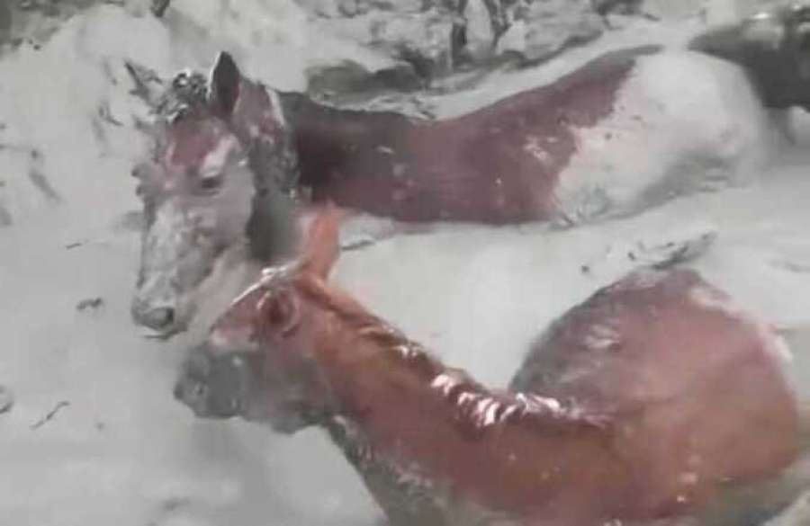 Стадо лошадей провалилось в глиняную яму в Дагестане. Один из скакунов уже погиб, остальные не могут сдвинуться хотя бы на сантиметр.